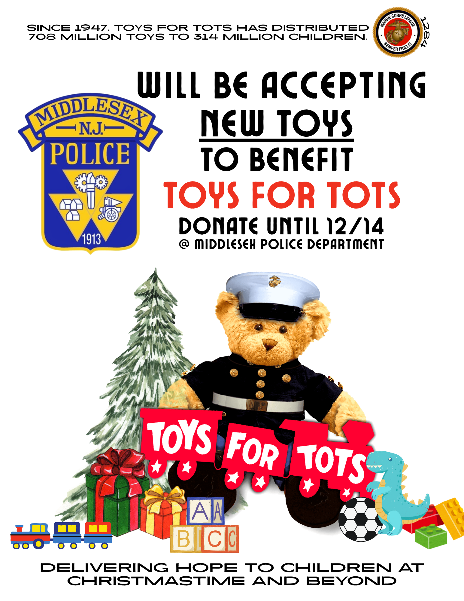 The Middlesex Borough Police Department will be collecting new and unwrapped toys for Toys for Tots. The foundation has been collecting toys for economically disadvantaged children at Christmas since 1991. Under the coordination of Marine Corps League #1284, the toy collection will go through December 14th.